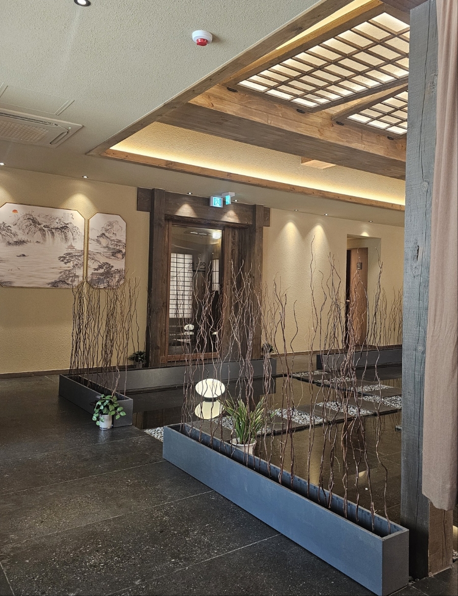 내부인테리어는 가운데는 진짜 물이 있어서 편안한 분위기를 자아낸다. 따뜻한 조명도 좋고 룸은 입구의 문이 없는 구조의 룸도 있어서 개방감이 있는 점도 좋은 거 같다. 외부에서는 간단하게 식사하기에 좋고 징검다리처럼 생긴 길로 걸어가는 재미도 있다.