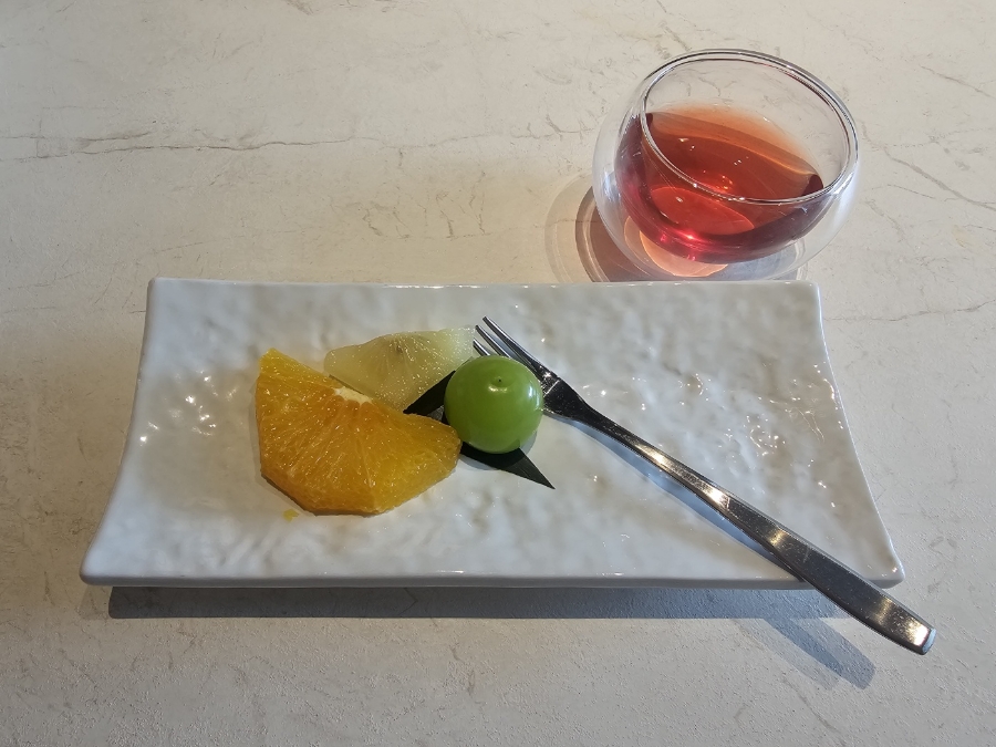마무리는 계절과일로 오렌지, 키위, 샤인머스켓으로 입안이 달콤하게 깔끔해진다. 오미자차는 조금 많이 달긴 하지만 맛있다. 2층에는 카페가 있어서 식사 후 한건물에서 차를 즐기기에도 좋다.