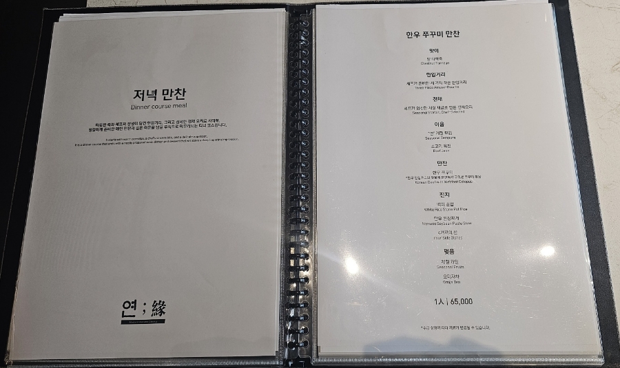 6명이 한자리에 앉을 수 있는 6인용 테이블도 있어서 좋고 밥과 된장찌개도 각각 한상으로 나와서 좋은 거 같다. 보통 한정식 식당에서는 코스로 먹으면 앞에 여러 가지를 먹고 마지막에 밥과 국이 나오는 구조여서 밥 먹으면서 맛있는 반찬으로 먹고 싶을 때가 있는데 연에서는 한상에 이렇게 메인과 반찬이 같이 나와서 좋은 거 같다.