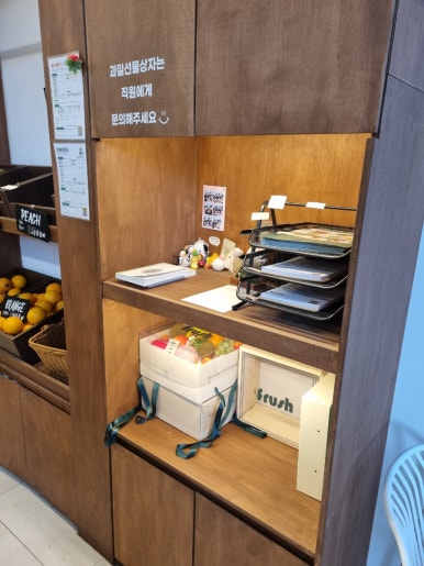 프루쉬는 이렇게 매장 내부로 들어가서 주문할 수 있어서 과일을 이것저것 보고 살 수도 있는 장점이 있고 과일바구니 단체 과일도시락 등도 주문이 가능한 곳인데 타르트 메뉴도 있고 요즘 잘 없는 찰옥수수도 있어서 약간의 가벼운 식사로도 즐기기에 좋다.