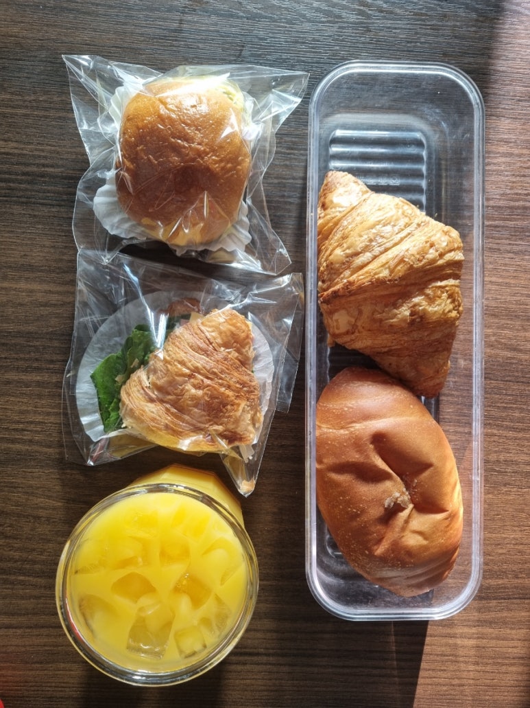 샌드위치도 에그마요는 올리브도 들어가서 아침식사 대용으로도 좋고 모닝빵도 무척 맛있다. 크로와상에 있는 샌드위치는 치즈, 햄, 토마토가 들어가 있어서 야채랑 같이 신선하게 먹고 싶다면 추천하고 싶다. 샌드위치도 반쪽도 있어서 무척 좋은거 같다. 사실 이렇게 큰 크로와상은 하나를 다 샌드위치로 먹으면 부담스러운데 이렇게 반쪽씩도 판매가 되니까 가볍게 먹기에 좋은거 같다.