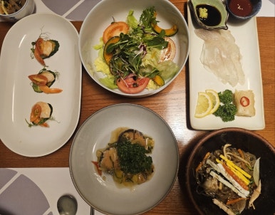 전복죽과 부드러운 계란찜과 시원한 묵채 등 다양하게 나오고 6만원 으로 주문을 하면 회도 조금씩 나와서 한두 점 맛볼 수 있기에 부모님과 한정식으로 골고루 즐기기에 좋다. 메뉴의 구성은 잡채, 전복구이, 샐러드 등이 나오고 새우도 상큼하게 오이와 같이 입안을 상큼하게 해주는 요리도 있고 잘 구워진 새우도 있어서 새우가 들어간 요리가 많이 나오는 듯하다.