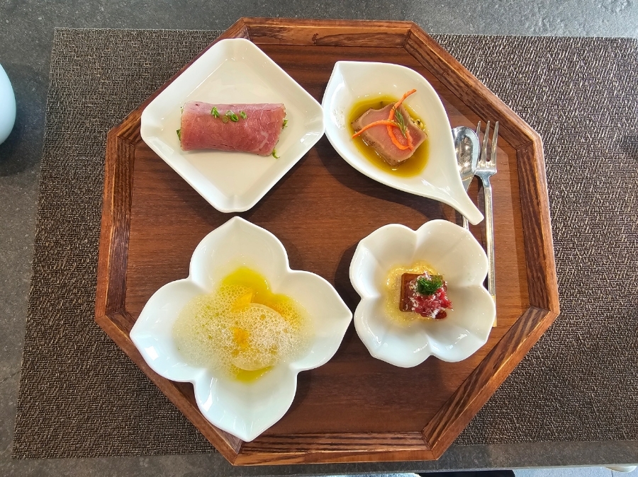 그 다음으로는 유자청이 들어간 깔끔하게 상큼한 메뉴가 있고 구운 두부위에 올려진 육회도 고소하고 한우 안심으로 직접 소시지를 만들어 야채를 말아서 내어 주시는데 무척 부드럽게 맛있다. 음식의 간이나 부드러운 식감이 좋아서 더 맛있게 즐길 수 있다.