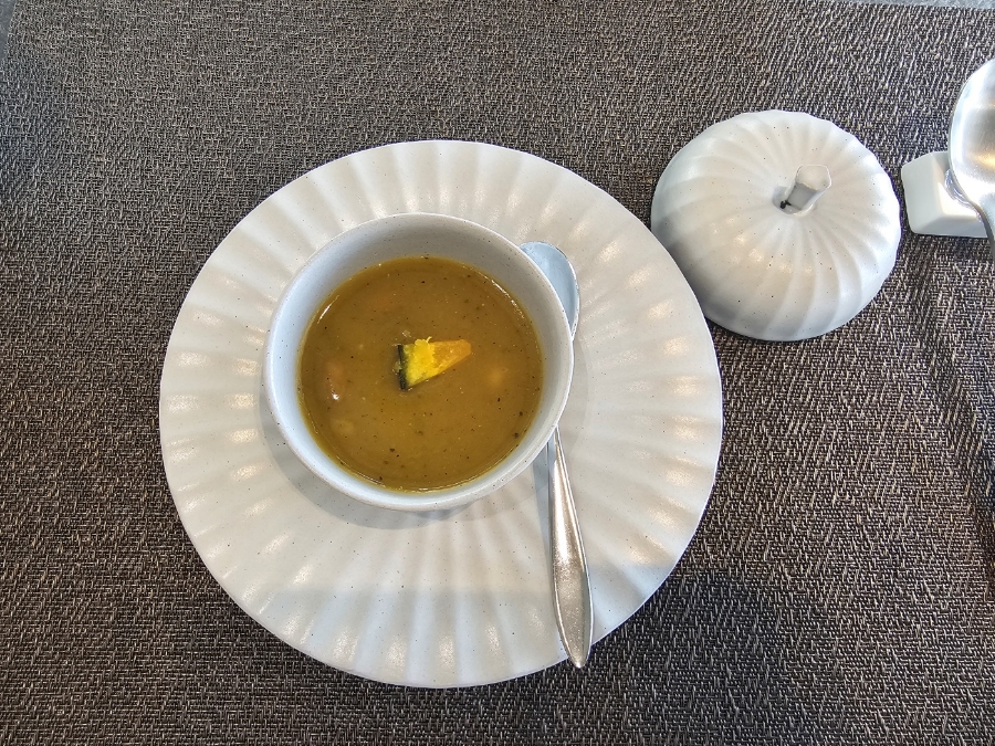 예약을 하고 가면 친절하게 안내해주시는데 시작은 호박스프 같은 따끈한 스프로 시작하는데 부드러운 호박스프라기 보다는 콩과 여러가지가 들어간 건더기가 있는 콩이 들어가기에 영양도 있는 따끈한 스프로 시작 한다.
