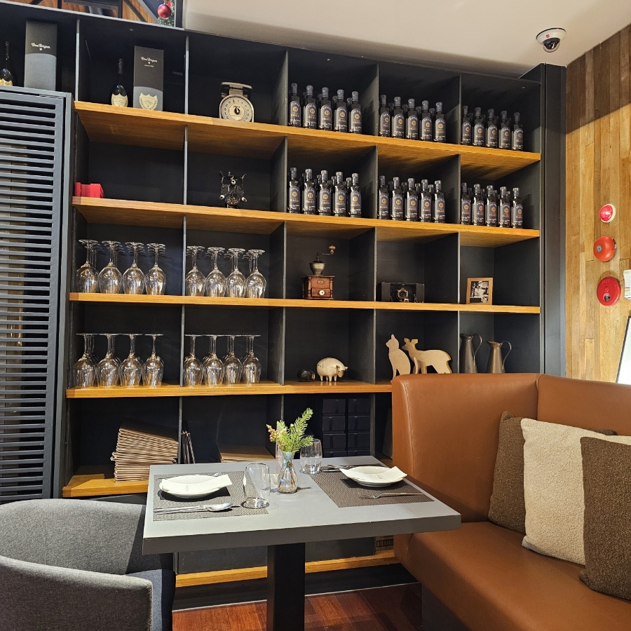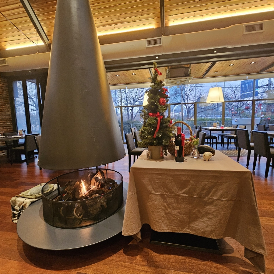 내부 인테리어는 장작도 많이 있고 와인잔과 층고가 무척 높고 통창으로 되어 있어서 개방감이 좋아 답답하지 않고 이야기를 나누기에 좋다. 공간이 크다 보니 옆 테이블의 이야기 소리도 거의 들리지 않아서 조용하게 식사를 즐기고 싶다면 추천하고 싶은 장소다. 또 하나 좋았던 점은 직접 주문을 받는 시스템이어서 편리하고 계산도 자리에서 바로 카드를 건네면 해주셔서 조금 더 편리한 거 같다.
