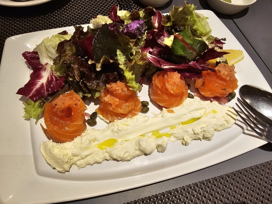 코스메뉴도 있는데 코스메뉴에는 스테이크로만 구성이 되어 있어서 파스타를 좋아 한다면 하나씩 단품으로 즐기는 게 더 좋은 거 같다. 식전빵은 따끈하게 나와서 좋은데 약간 바게트처럼 딱딱한 부분도 있어서 수프에 찍어 먹어도 맛있고 그냥도 고소하게 맛있다. 연어 샐러드는 신선하게 나오고 야채도 무척 신선하고 드레싱은 레몬이 들어가서 상큼하게 산미가 높은 편이다.