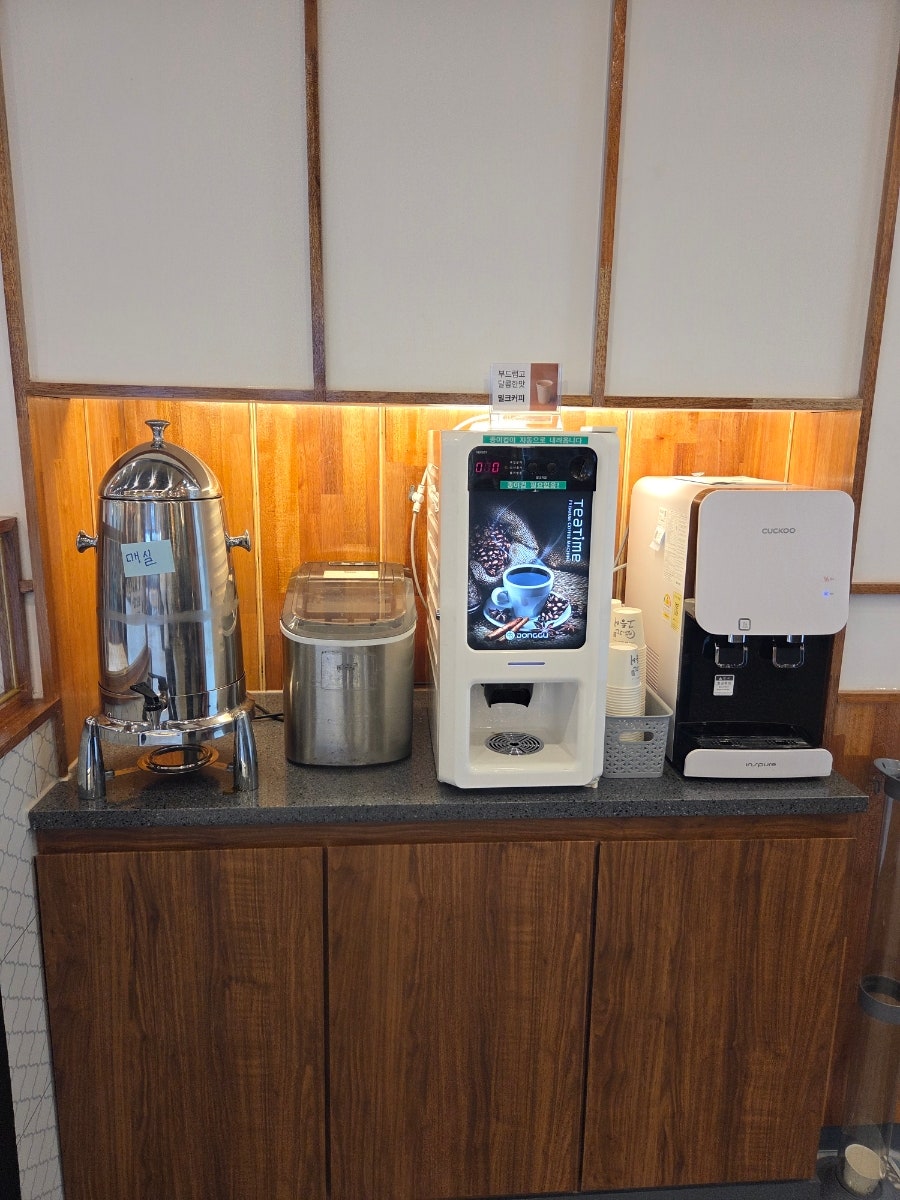 테이블 위에 물과 종이컵이 있지만 물은 차가운 생수여서 셀프바에 있는 숭늉을 먹는게 따뜻하고 더 좋다.