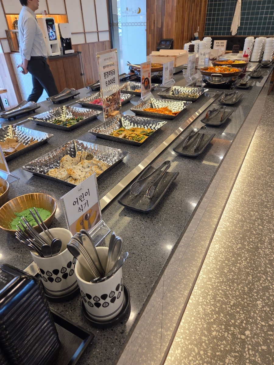 셀프바에는 도토리묵을 시작으로 겉절이, 연근무침, 잡채, 계란말이, 케찹, 두부조림, 피클, 편백양배추찜, 숭늉, 톳나물, 어묵볶음 등 반찬이 신선하고 간도 적당하고 맛있었다. 요렇게 셀프바가 있는 곳은 오픈 시간에 가야 재료도 신선하고 맛있는거 같다.