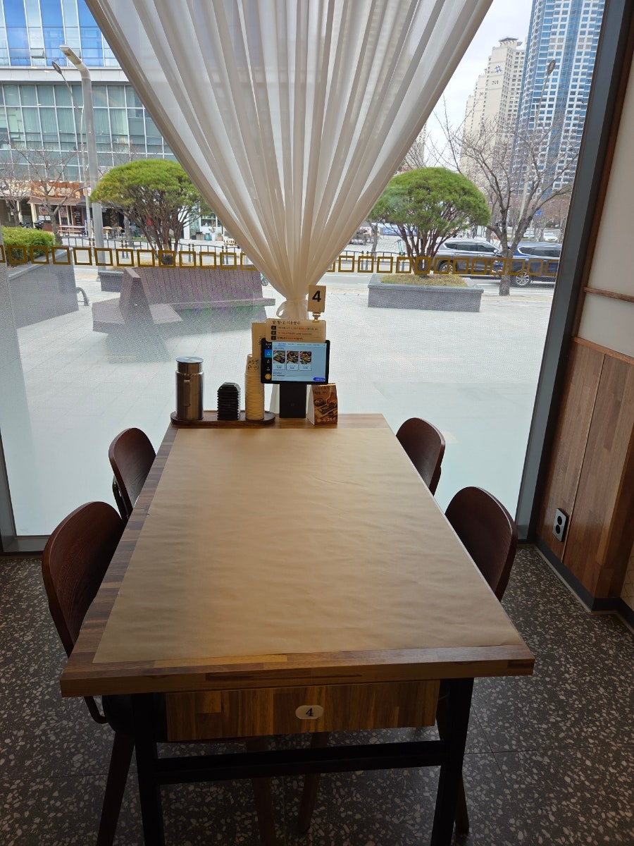 내부 홀은 4인석 테이블이 많고 창가쪽은 테이블 간격이 넓어서 조용하게 식사하기에 좋은고 통창과 높은 층고가 주는 개방감이 좋다.