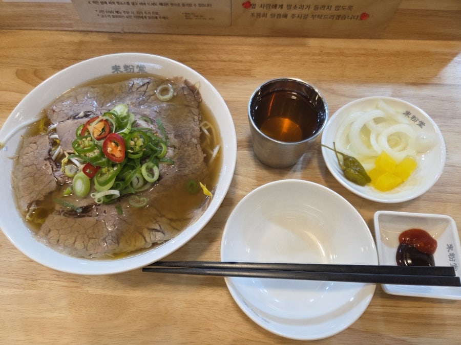 그런데 생각보다 음식이 나오는 속도가 엄청 빠르다. 결제하면 바로 만드시는거 같던데 그래서 인지 자리에 앉고 거의 1분 지났으려나 바로 나와서 깜짝 놀랐는데 식사 시간이 부족 할때 빨리 나오는 메뉴를 찾고 있다면 추천하고 싶다. 쌀국수여서 배가 좀 고플수도 있는데 고기의 양이 생각보다 제법 되어서 제법 든든 하다.