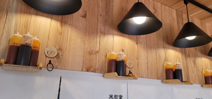 자리에 앉으면 바 위로 요렇게 쪼로미 다 내어주시고 고수는 애기를 하면 작은 접시에 내어주신다. 양파를 더해 먹으면 맛있고 소스는 해선장은 약간 짭조름 하고 핫소스는 약간 매콤해서 조금씩 넣어 먹으면 맛있고 고기를 찍어 먹어도 맛있다.
